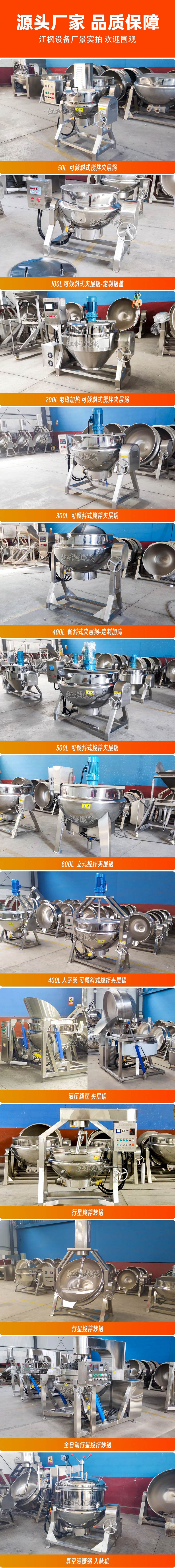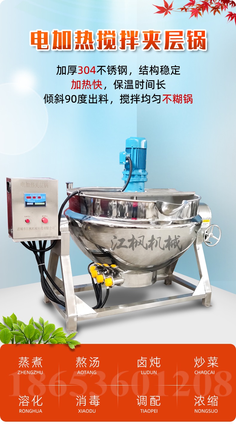 江枫机械设计的电加热可倾斜式搅拌高品质夹层锅可根据产品的品种和加工工艺不同,调节温度和时间,满足不同的需求。速度快,能力强。设备具有受热面积大、加热均匀、热效率高且温度容易控制等优点,提高产品质量,缩短工作时间亦可根据用户要求增加揽拌装置。