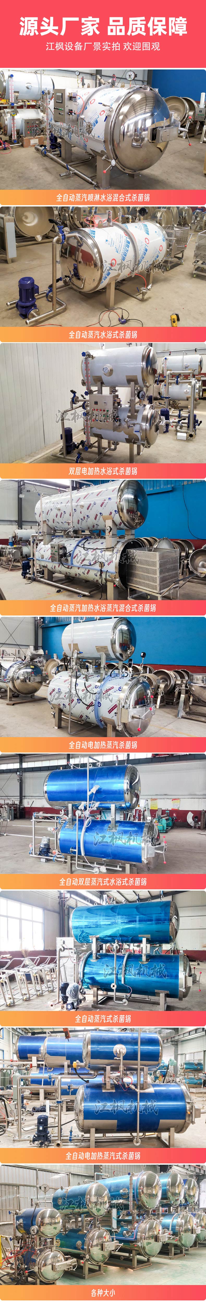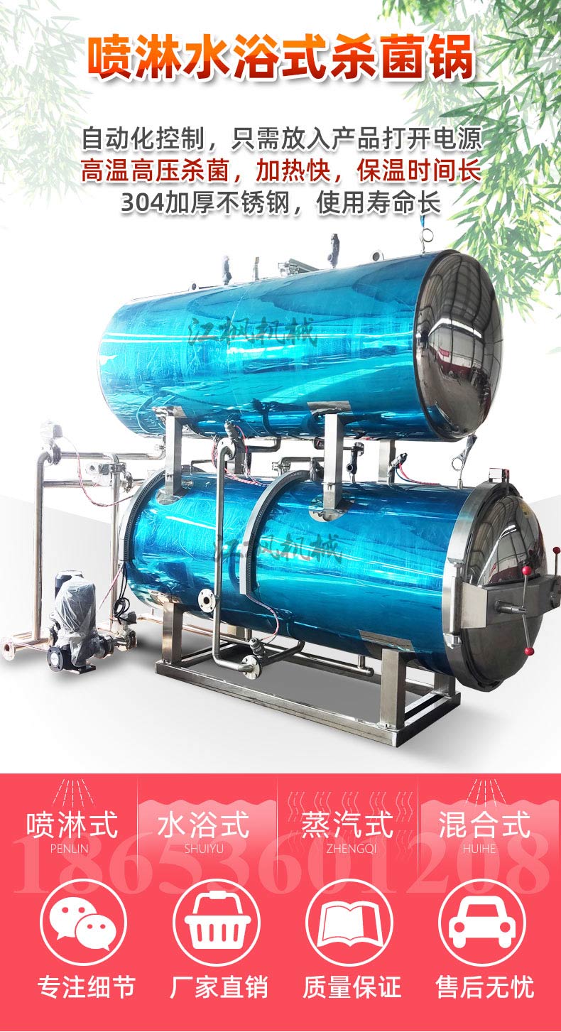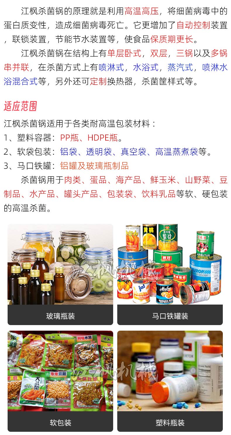 设备分为不锈钢/碳钢材质,支持蒸汽、电加热或混合加热,控制方式涵盖手动到全自动,安装形式有卧式、立式,杀菌方式包括水浴、蒸汽、喷淋等。主要应用于肉类、蛋品、海产品、素食等食品灭菌,也用于药品、化妆品包装的无菌处理。