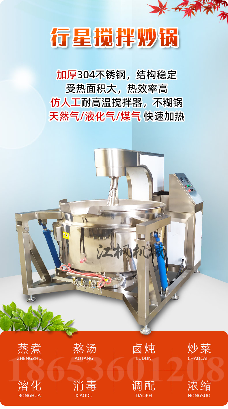 江枫行星搅拌炒锅是一种高效、多功能的食品加工设备,广泛应用于酱料、馅料、调味品等高粘度物料的搅拌、翻炒和熬制。其核心特点是采用行星式搅拌系统,即搅拌器在锅体内既围绕中心轴公转,又同时自转,形成复杂的运动轨迹,确保锅内物料无死角、均匀混合,避免糊锅或结块。燃气加热系统通过环形燃烧器与鼓风机配合,实现400℃范围内精准控温,升温迅速且热效率高。