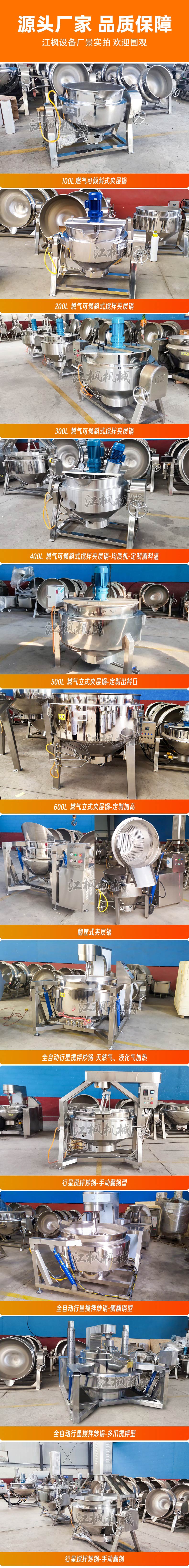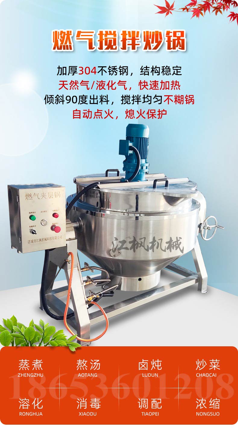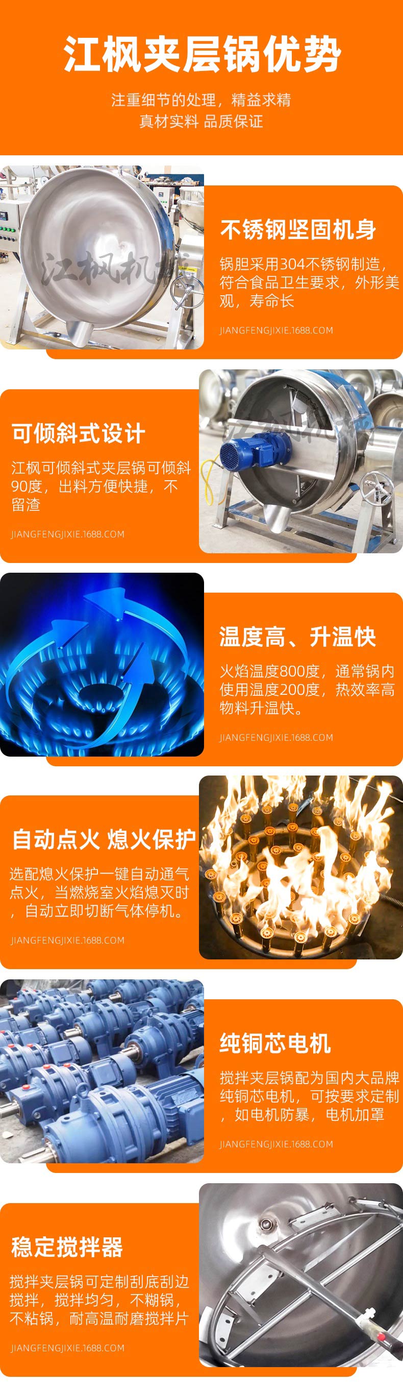 江枫燃气高品质夹层锅具有受热面积大,热效率高,加热均匀、物料沸腾时间短、加热温度容易控制等特点,其可用天然气、液化气、煤气等加热方式,适应不同地区的工作环境。直接点燃气可用气体,烧在锅体上,让锅体瞬间产生高热量,可选自动点火,熄火保护功能,江枫燃气炒锅适用于蒸煮食物,熬制糖稀,炒制蔬菜、调味品、药材和焙烤等,常用于餐饮和食品加工或化工制药等过程中加热搅拌炒制使用。